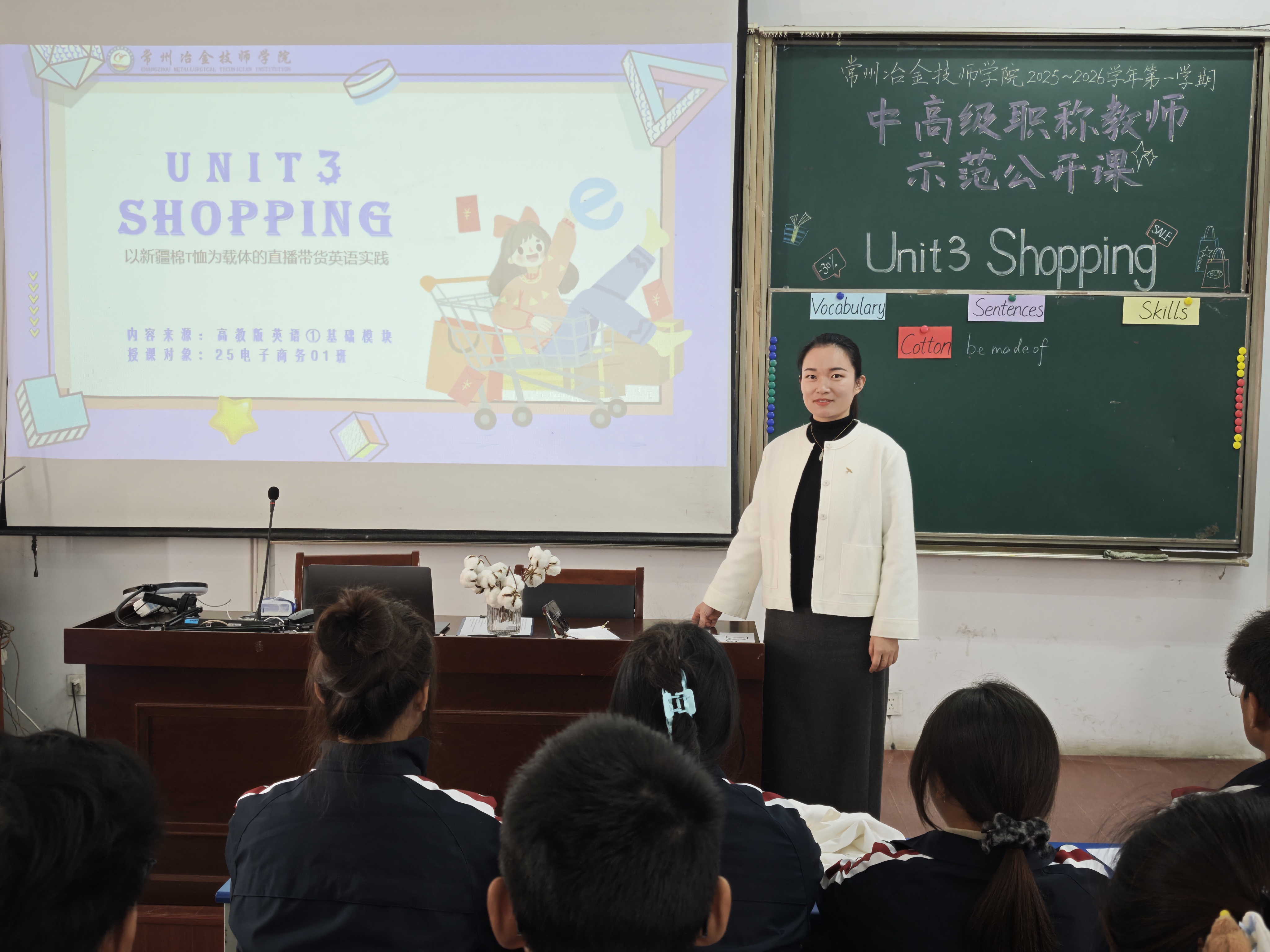 为深入推进新时代职业教育改革,持续提升课堂教学质量与人才培养成效,充分发挥教学名师的示范、引领与辐射作用,展现优秀教师的教学风采与创新实践,常州冶金技师学院数字服务系于2025年12月18日开展骨干教师示范课系列活动。本次活动中,英语课程名师韦骊以《以新疆棉T恤为载体的直播带货英语实践》为主题,面向25电商01班呈现了一堂融合专业、语言与思政的创新型英语示范课,系部全体教师现场观摩学习。