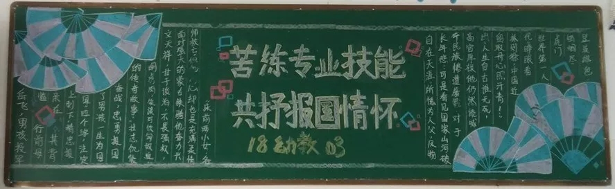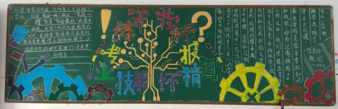 为弘扬苦练专业技能,共抒报国情怀的爱国主义精神,学院特组织了一期以“勤学技能,报效祖国”为主题的黑板报展示活动,让我们一起来看看同学们的作品: